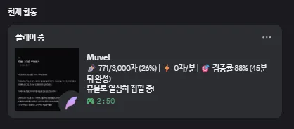 Discord 활동 실시간 연동 기능은 작품 정보 유출 없이 뮤블을 통한 집필 상황만을 메신저 앱인 Discord 를 통해 실시간으로 공유할 수 있는 기능입니다.